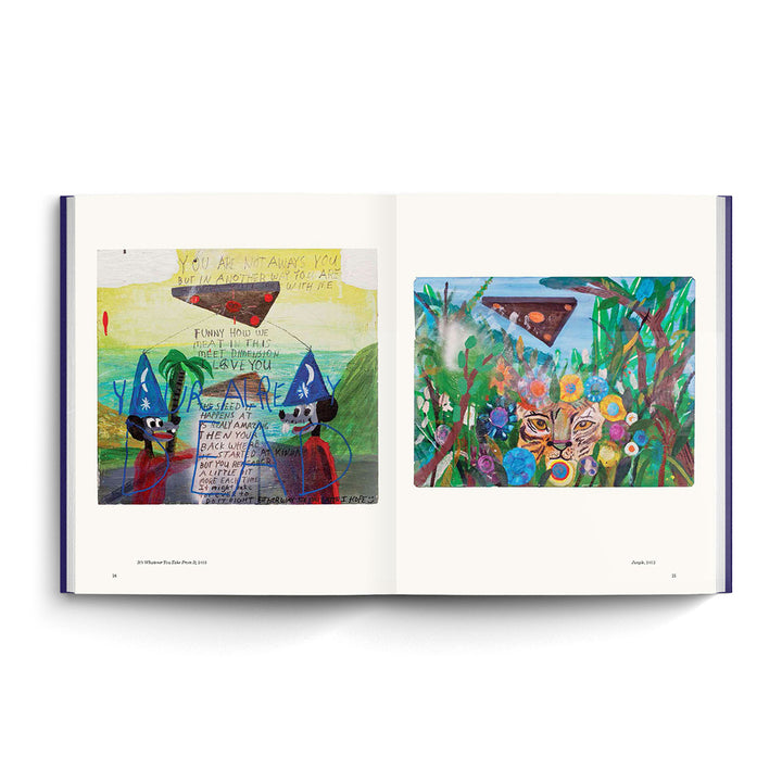 The paintings, drawings, and mixed-media works of Joe Roberts are transportive in the cosmic sense. Through their intuitive blend of styles and subjects, they serve as portals into a welcomingly hallucinatory world: a place where gleeful mashups of childhood signifiers (comic book detritus, cartoon mascots) exist cozily alongside countercultural reference points (ouija boards, sci-fi paperbacks, UFOs) and earnest flashes of the personal (diaristic sketches, confessional trip reports). Reissued for the first time since 2015, LSD Worldpeace documents the extraordinary creativity and scrappy methods of Roberts’s early career, replete with collages, action figures, and dioramas, in addition to the paintings for which he’s become so celebrated. With introductory texts by Myla DalBesio and Matthew Ronay, LSD Worldpeace is the product of a wildly imaginative artist moving freely between modes, guided by a boundless vision.